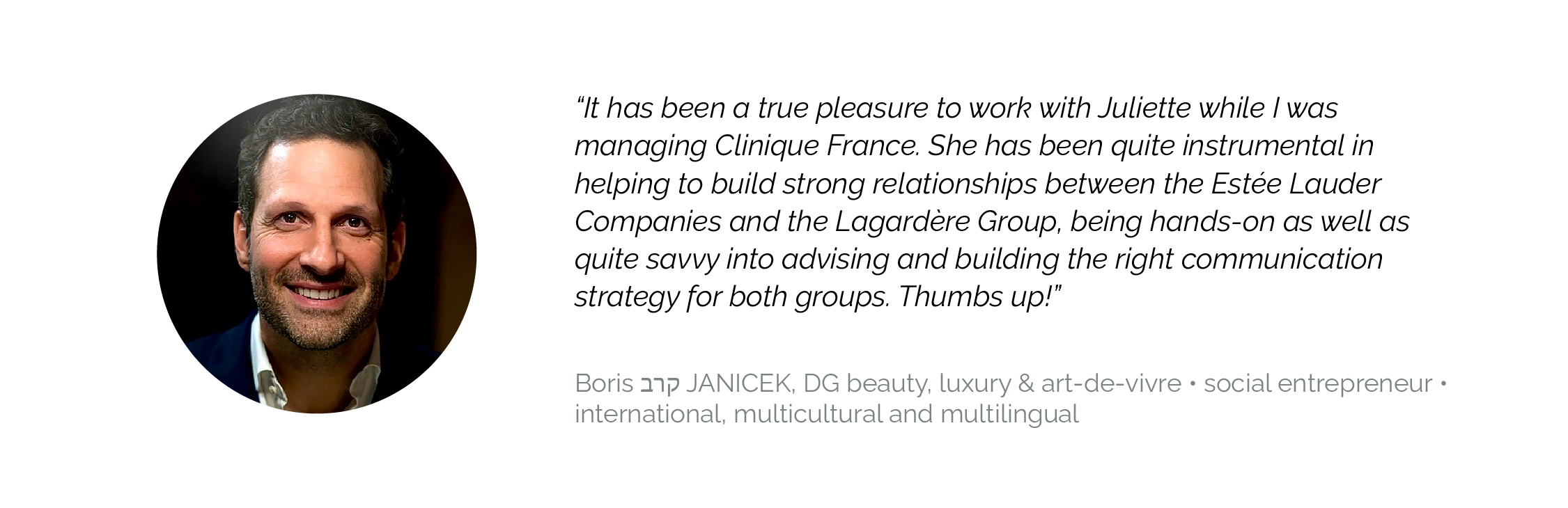 Through her unique global network, Juliette offers an agile, sharp, creative perspective firmly rooted in the power of human connections. Working with Juliette Granon Communication, companies achieve international positioning, visibility and desire for their larger brand, allowing themselves to grow, expand and exceed their goals.