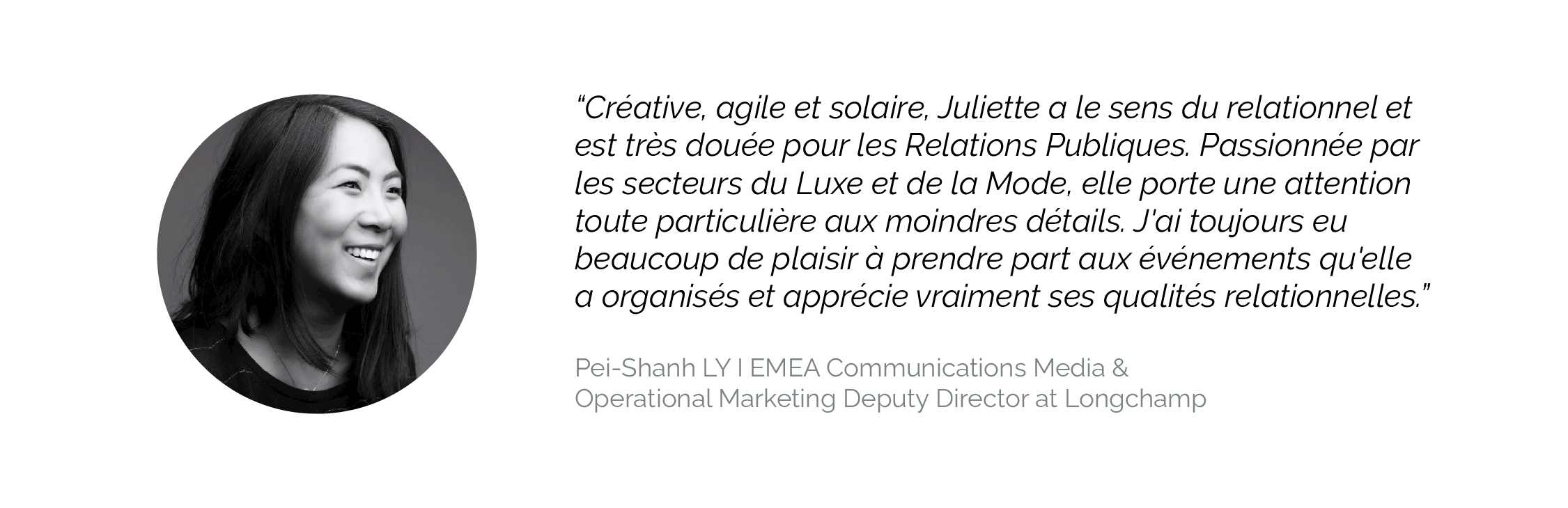Sa connaissance dans l’univers de la mode, de la beauté et des dernières tendances lui vient de son expérience de 6 ans en tant que Responsable des Relations Publiques chez ELLE France, avec l’organisation d’innombrables événements premium pour les annonceurs du magazine (LVMH, Rolex, Dior, Chanel,…). Elle a également participé à plusieurs Fashion Weeks à Paris jusqu’à récemment pour F*Hits, Alice Ferraz, & Farm Rio. Elle a voyagé internationalement en accompagnant la Presse et les faiseurs d’opinion.